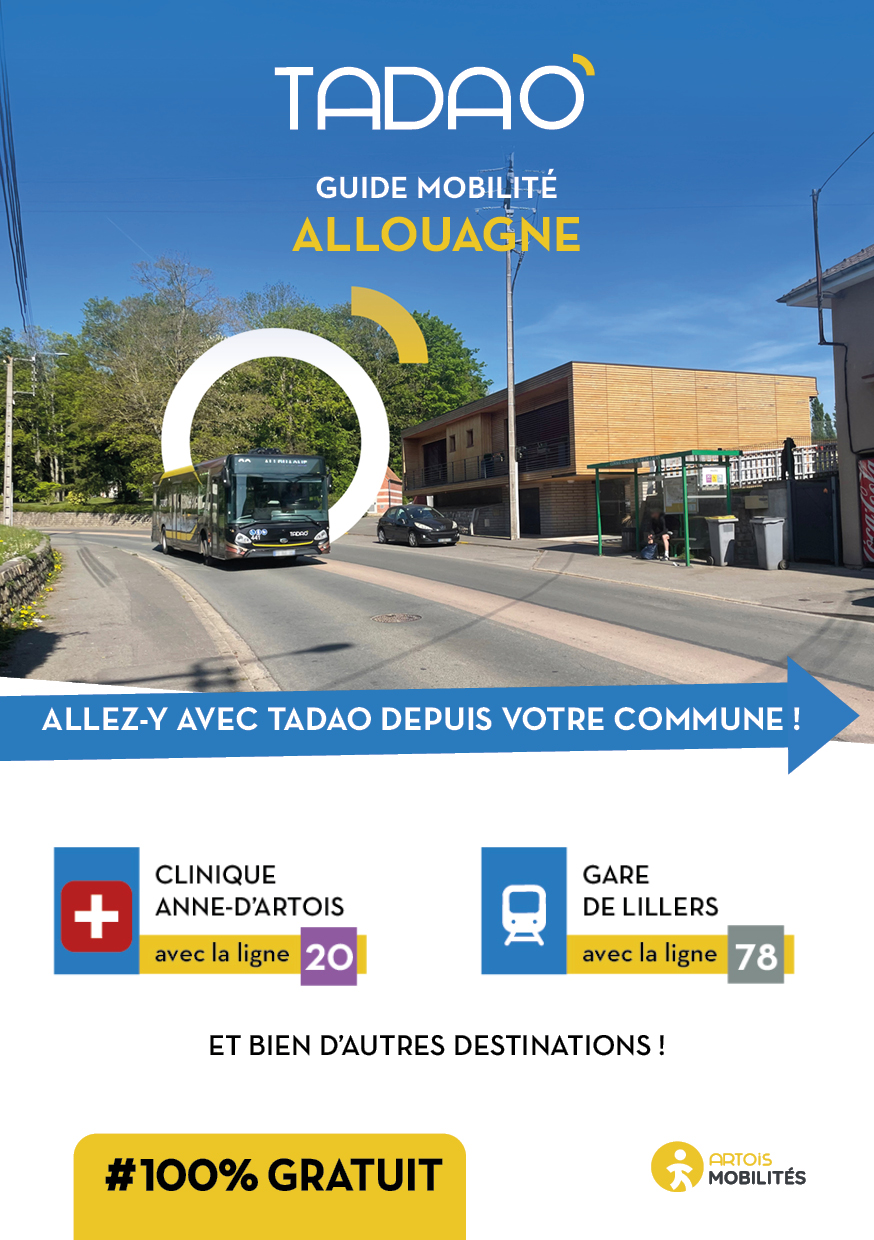 ALLOUAGNE Les services TADAO sur la commune Télécharger le GUIDE de votre commune au format PDF Télécharger le GUIDE au format ZIP avec les JPEG Téléchargements Envoyer cette page par email : Votre demande a bien été prise en compte et sera traitée dès que possible Votre nom* Votre adresse email* Adresse du destinataire* Commentaire https://www.artois-mobilites.fr/allouagne/ Code de vérification* Envoyer *champs obligatoires