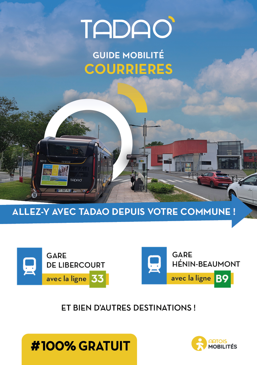 COURRIERES Les services TADAO sur la commune Télécharger le GUIDE de votre commune au format PDF Télécharger le GUIDE au format ZIP avec les JPEG Téléchargements Envoyer cette page par email : Votre demande a bien été prise en compte et sera traitée dès que possible Votre nom* Votre adresse email* Adresse du destinataire* Commentaire https://www.artois-mobilites.fr/courrieres/ Code de vérification* Envoyer *champs obligatoires