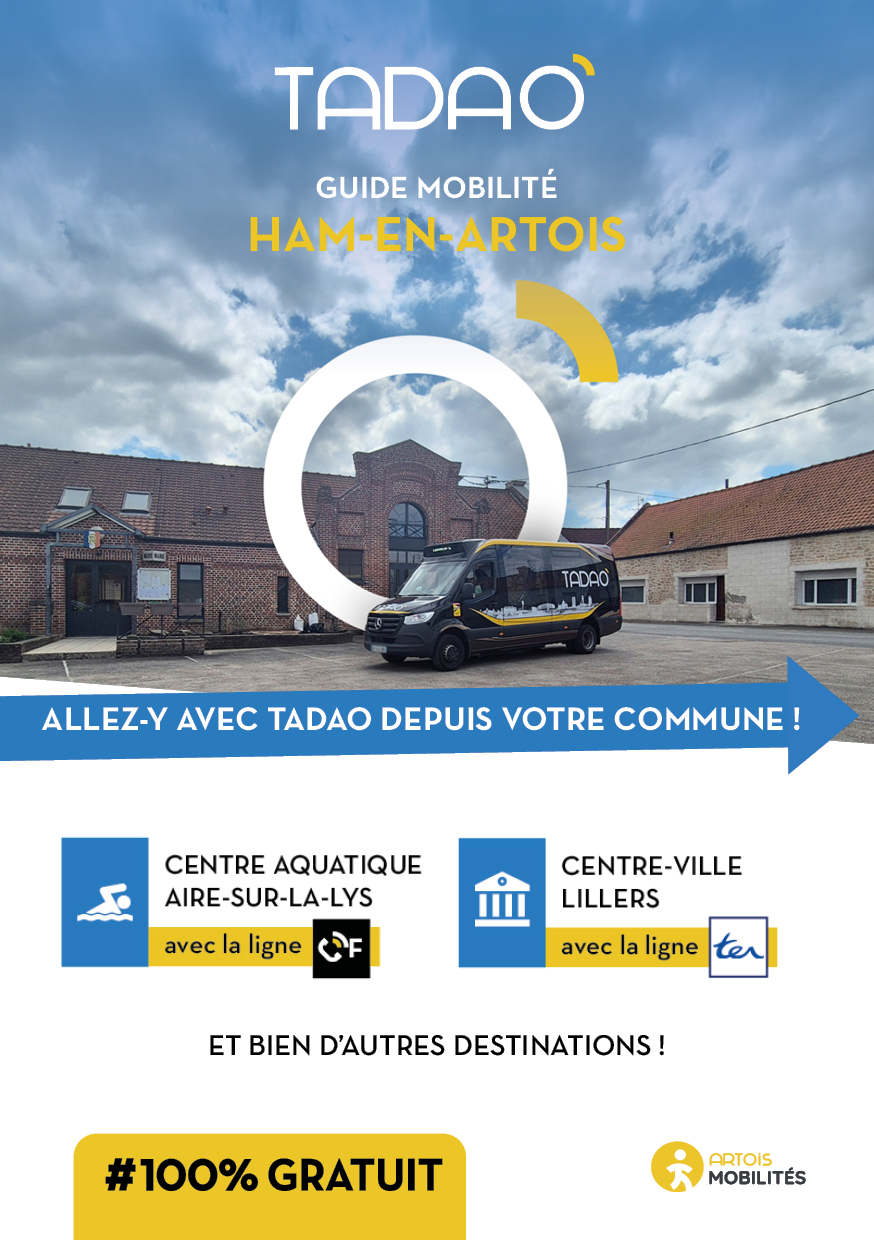 HAM-EN-ARTOIS Les services TADAO sur la commune Télécharger le GUIDE de votre commune au format PDF Télécharger le GUIDE au format ZIP avec les JPEG Téléchargements Envoyer cette page par email : Votre demande a bien été prise en compte et sera traitée dès que possible Votre nom* Votre adresse email* Adresse du destinataire* Commentaire https://www.artois-mobilites.fr/ham-en-artois/ Code de vérification* Envoyer *champs obligatoires