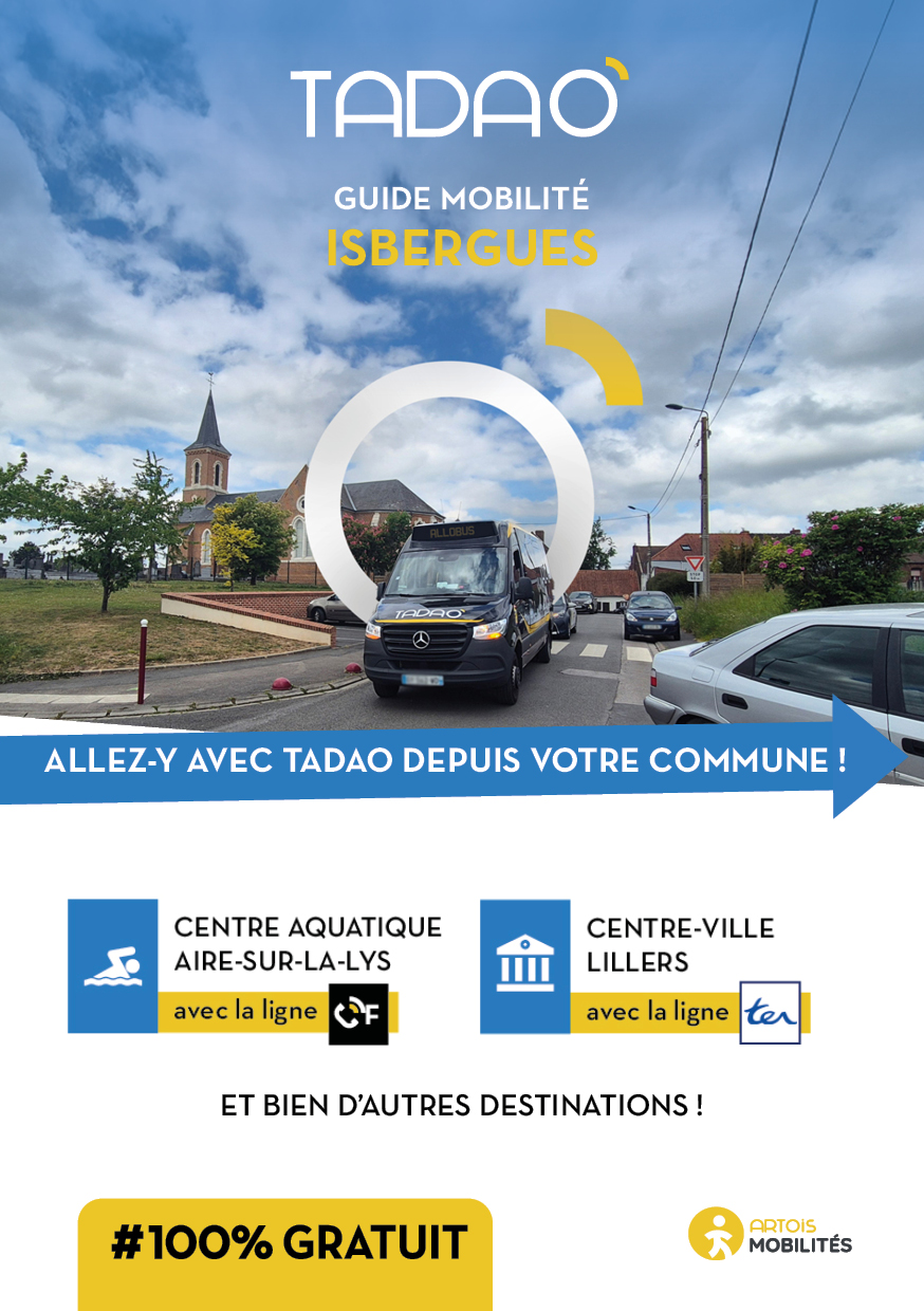 ISBERGUES Les services TADAO sur la commune Télécharger le GUIDE de votre commune au format PDF Télécharger le GUIDE au format ZIP avec les JPEG Téléchargements Envoyer cette page par email : Votre demande a bien été prise en compte et sera traitée dès que possible Votre nom* Votre adresse email* Adresse du destinataire* Commentaire https://www.artois-mobilites.fr/isbergues/ Code de vérification* Envoyer *champs obligatoires