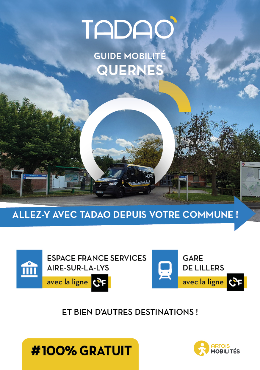 QUERNES Les services TADAO sur la commune Télécharger le GUIDE de votre commune au format PDF Télécharger le GUIDE au format ZIP avec les JPEG Téléchargements Envoyer cette page par email : Votre demande a bien été prise en compte et sera traitée dès que possible Votre nom* Votre adresse email* Adresse du destinataire* Commentaire https://www.artois-mobilites.fr/quernes/ Code de vérification* Envoyer *champs obligatoires