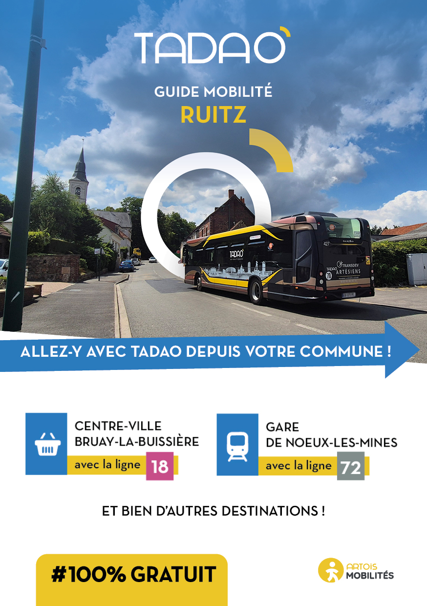 RUITZ Les services TADAO sur la commune Télécharger le GUIDE de votre commune au format PDF Télécharger le GUIDE au format ZIP avec les JPEG Téléchargements Envoyer cette page par email : Votre demande a bien été prise en compte et sera traitée dès que possible Votre nom* Votre adresse email* Adresse du destinataire* Commentaire https://www.artois-mobilites.fr/ruitz/ Code de vérification* Envoyer *champs obligatoires